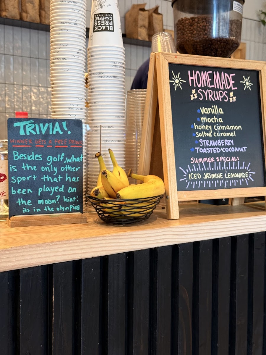 Overall, the menu at Black Press Coffee offers a concise yet creative selection that leans into unique flavor pairings and seasonal touches. The range of syrups-like Mocha, Rose, Lavender Honey Cinnamon, and Coconut-adds a customizable and slightly adventurous twist to classic coffee options, while additional flavors such as Vanilla, Salted Caramel, Strawberry, and Toasted Coconut round out the lineup with both familiar and indulgent notes. The highlight among their limited-time offerings is the refreshing Iced Jasmine Lemonade, which stands out as a bright, summery alternative to heavier drinks. Though the menu is not overly extensive, its thoughtful curation and emphasis on distinctive flavors make it appealing for both traditional coffee lovers and those looking to try something a bit different.